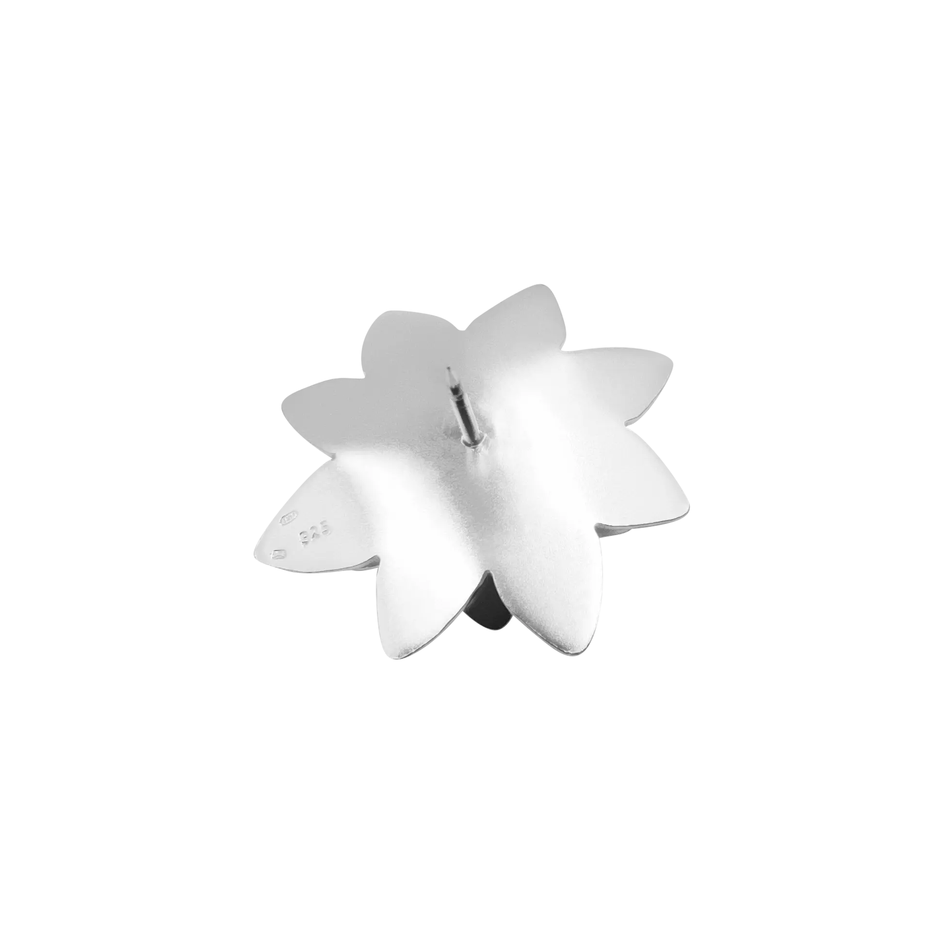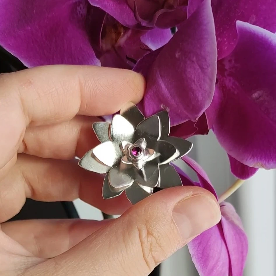 Broșă realizată manual în atelier propriu din argint reciclat. Piesa este construită din trei layere suprapuse, pentru volum și profunzime, și este decorată central cu un rubin sintetic de 3 mm.