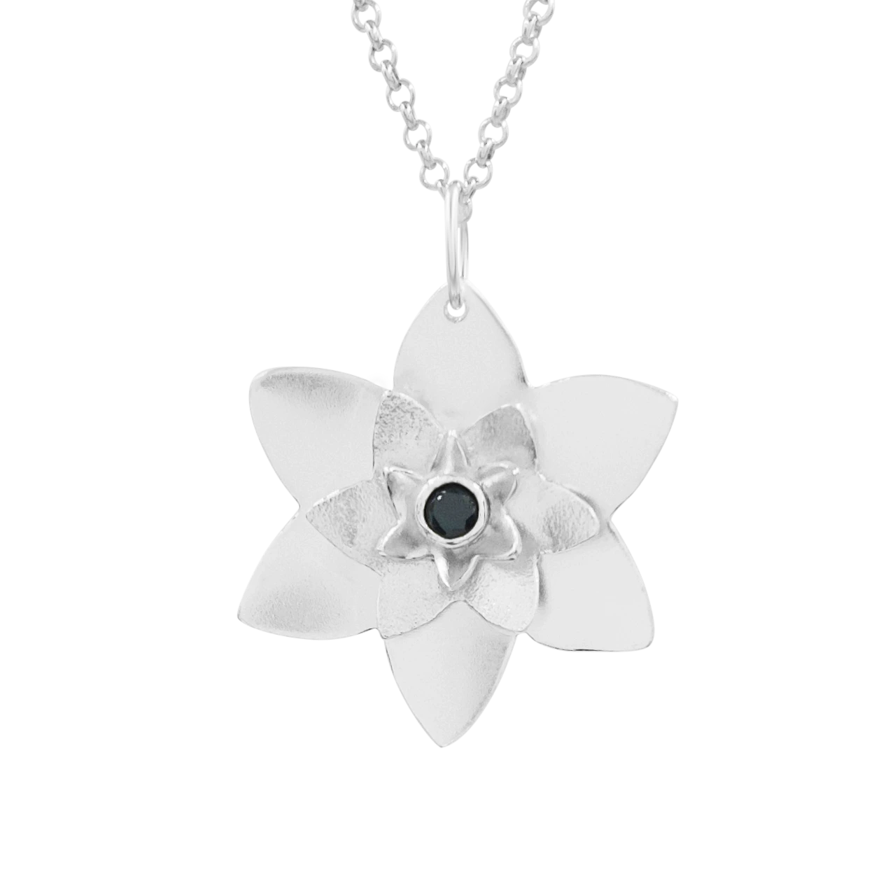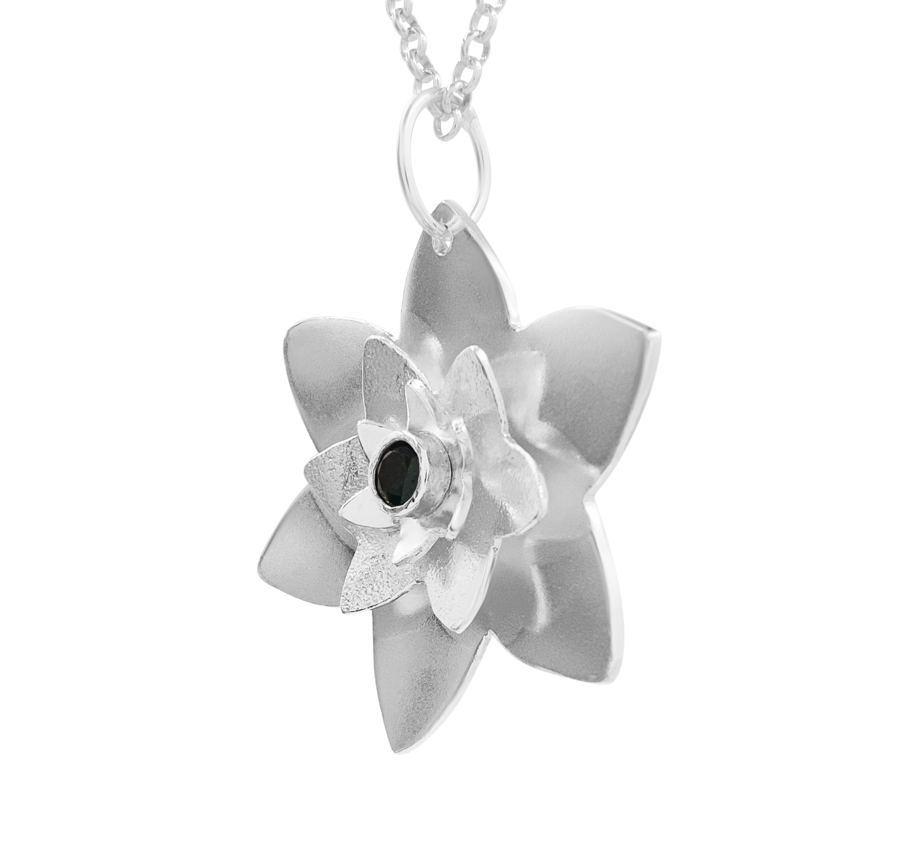 Pandantiv realizat manual din argint, în formă de lotus, decorat cu piatră zirconiu montată central. Designul este delicat și versatil, potrivit pentru purtare zilnică sau cadou.
