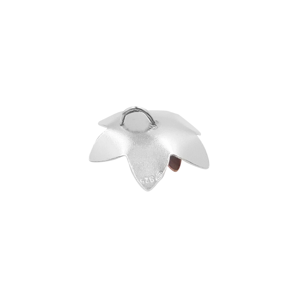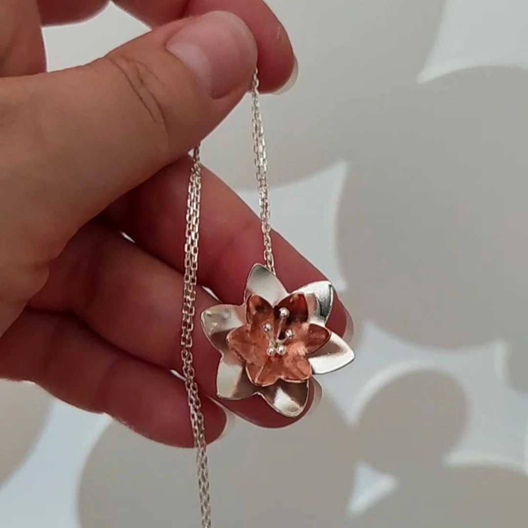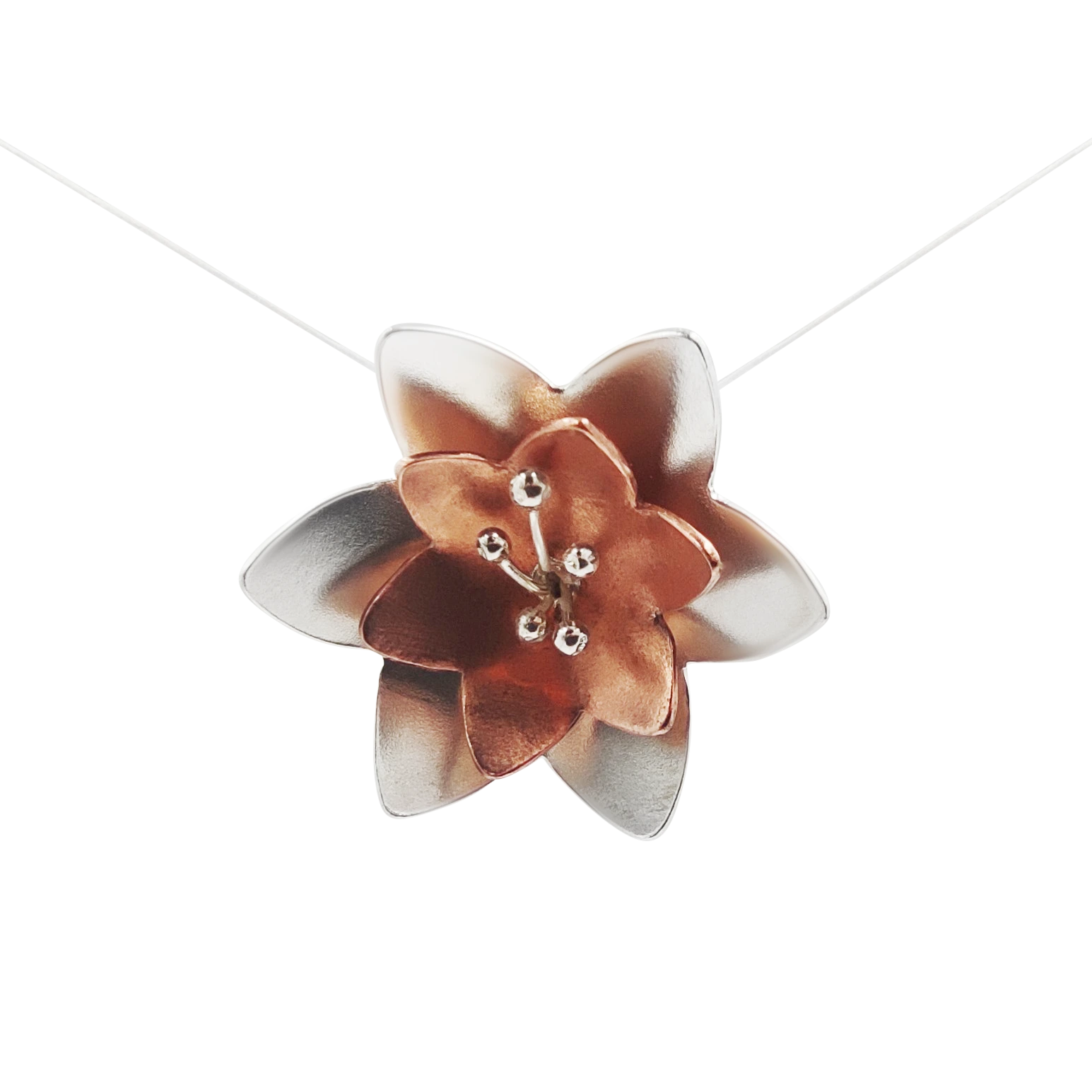 Pandantiv realizat manual în atelier propriu, în formă de floare, combinând argint și cupru. Piesa este construită din două layere — unul din argint și unul din cupru — pentru contrast și profunzime.