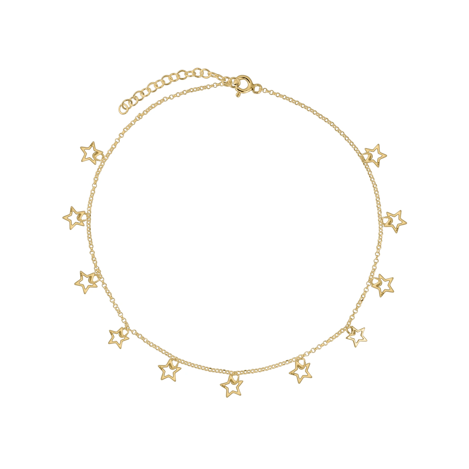 Bratara de picior din argint placat cu aur cu stele mici decupate. Ajustabila de la 22 la 27 cm, bratara se expediaza in cutiuta de bijuterii impreuna cu certificat de garantie si autenticitate.