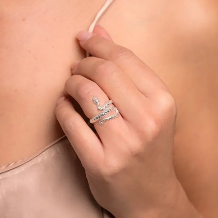 Inelul reglabil în formă realistă de șarpe este confecționat din argint 925 de înaltă calitate - fără nichel, cadmiu sau crom. La cerere, se poate adauga patină sau se poate placa cu aur.