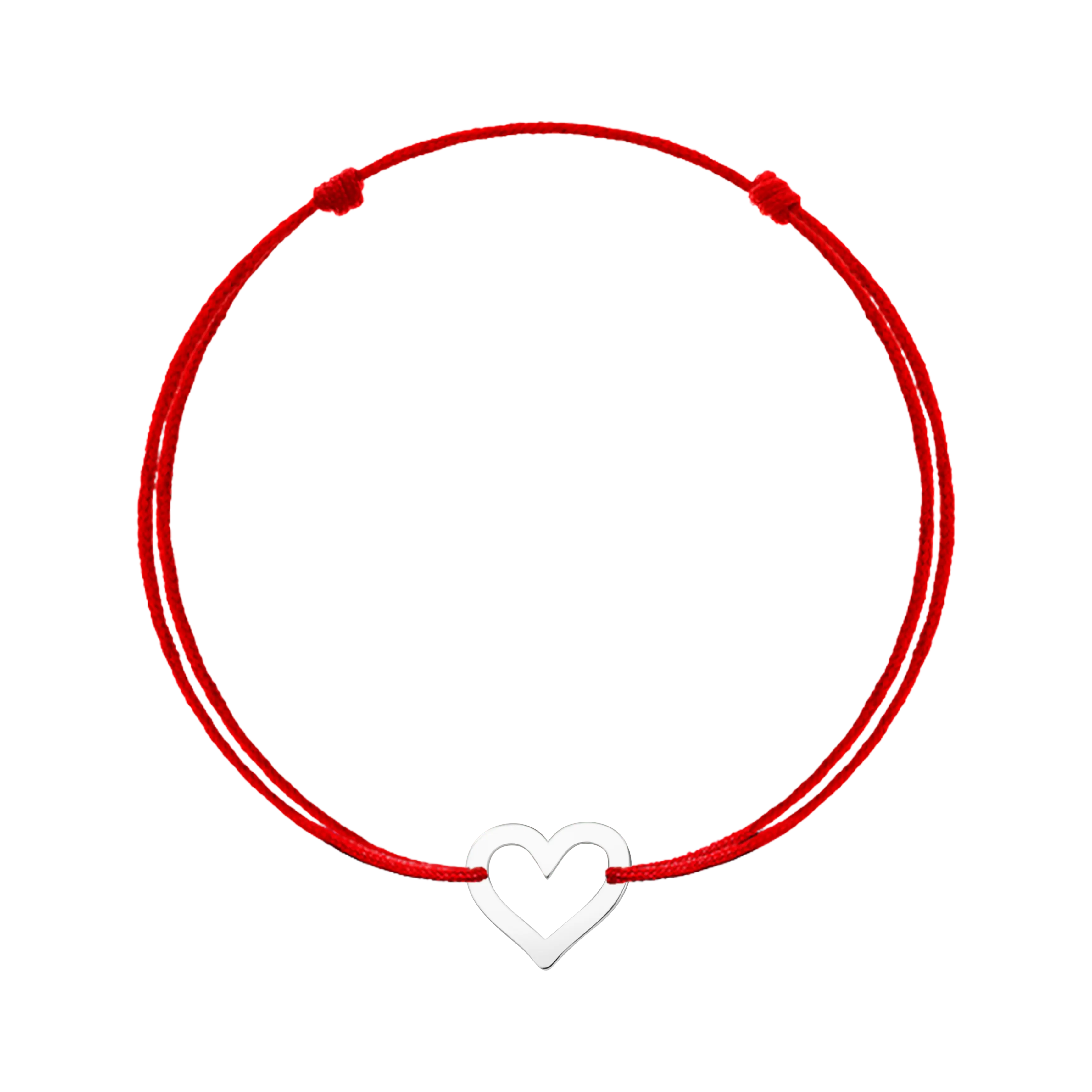 Brățară realizată pe șnur roșu rezistent, accesorizată cu o inimă decupată din argint de aproximativ 1 cm. Sistemul de închidere cu noduri culisante permite ajustarea ușoară pe orice încheietură.