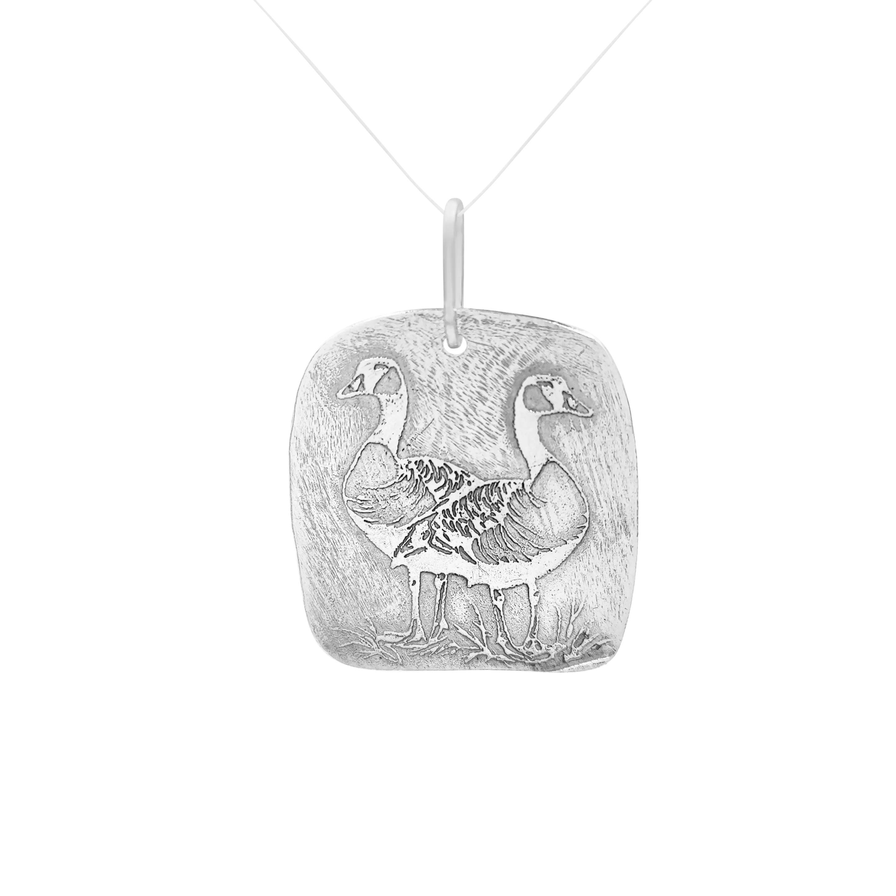 Pandantiv realizat manual din argint, reprezentând un peisaj inspirat din Delta Dunării, cu două rățuște stilizate integrate în compoziție.