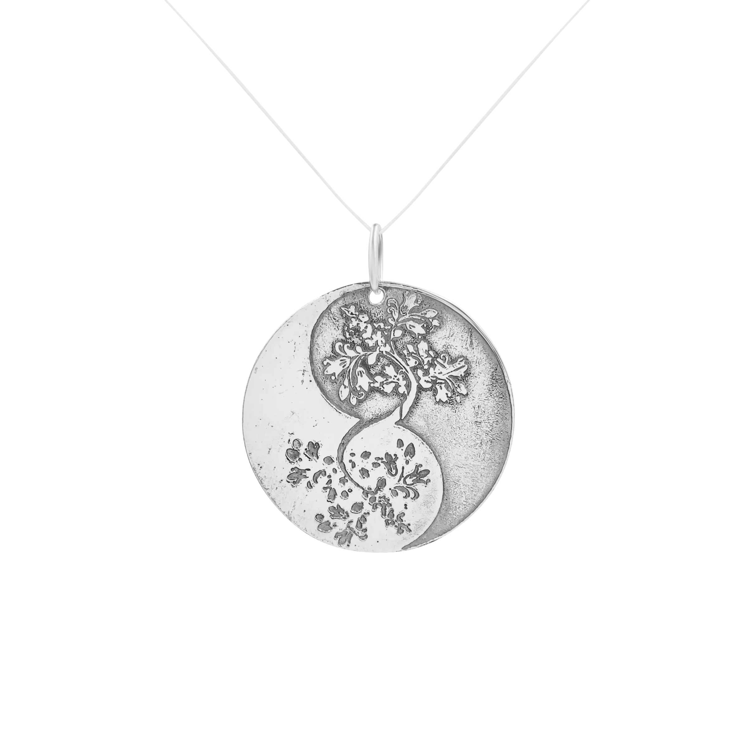 Acest pandantiv din argint este realizat manual în atelier propriu și îmbină două simboluri puternice: Pomul Vieții și conceptul yin-yang.