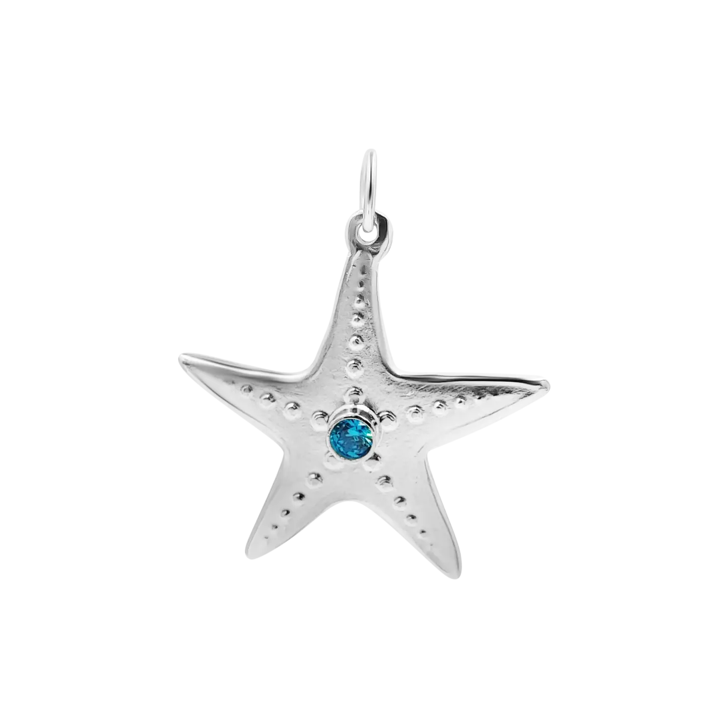 Pandantivul în formă de stea de mare a fost realizat manual prin metoda gravurii chimice și a traforării. Confecționat din argint 925, pandantul are montată o piatră zirconiu de 3mm de culoarea acvamarinului.