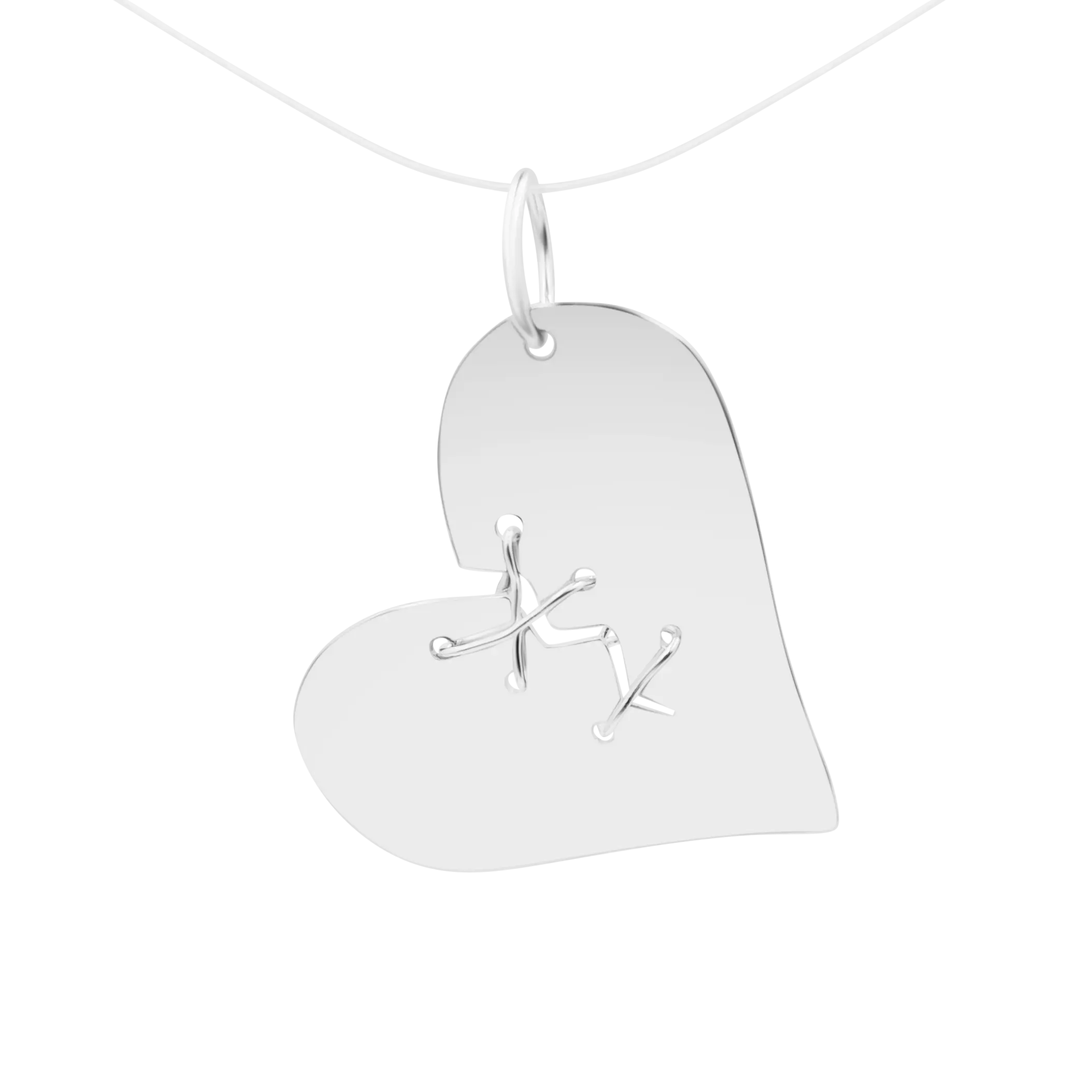 Confecționat din argint reciclat în atelierul propriu, pandantivul Broken Heart este o bijuterie unicat în formă de inimă tăiată în două și cusută cu fir din argint pur. Fiind o piesă lucrată și patinată manual, mici imperfecțiuni sunt vizibile.